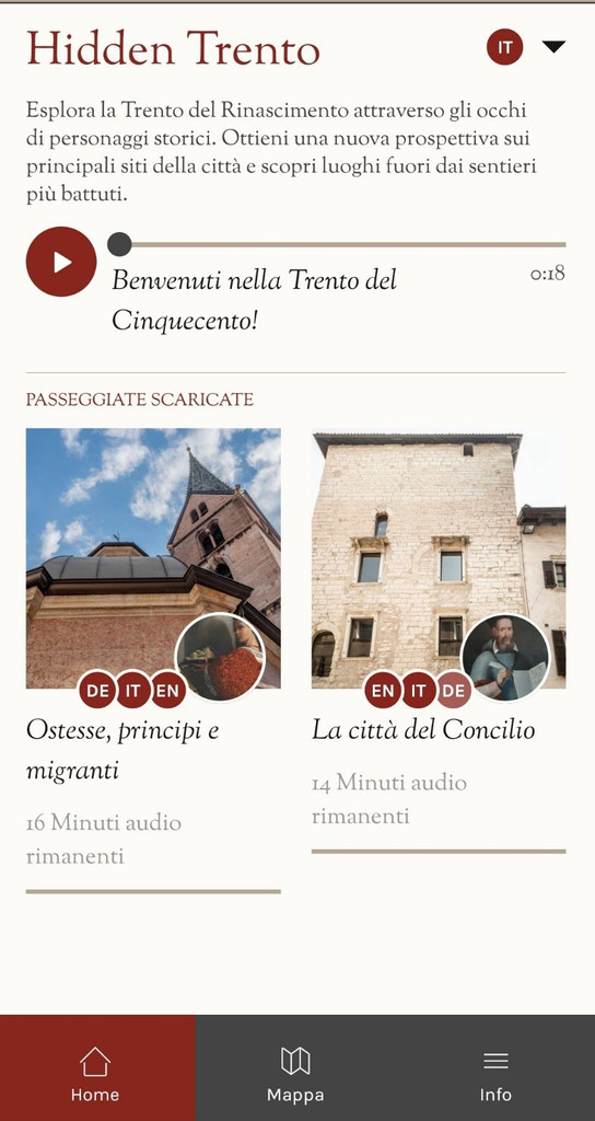 On 19 November 2020, the first walking tour, Innkeepers, princes and migrants, guided by the German innkeeper Ursula, was published by researchers of the Istituto Storico Italo-Germanico, FBK. On 20 October 2021, the team introduced a second tour, The City of the Council, with a new protagonist, Angelo Massarelli, the famous secretariat of the Council of Trent.