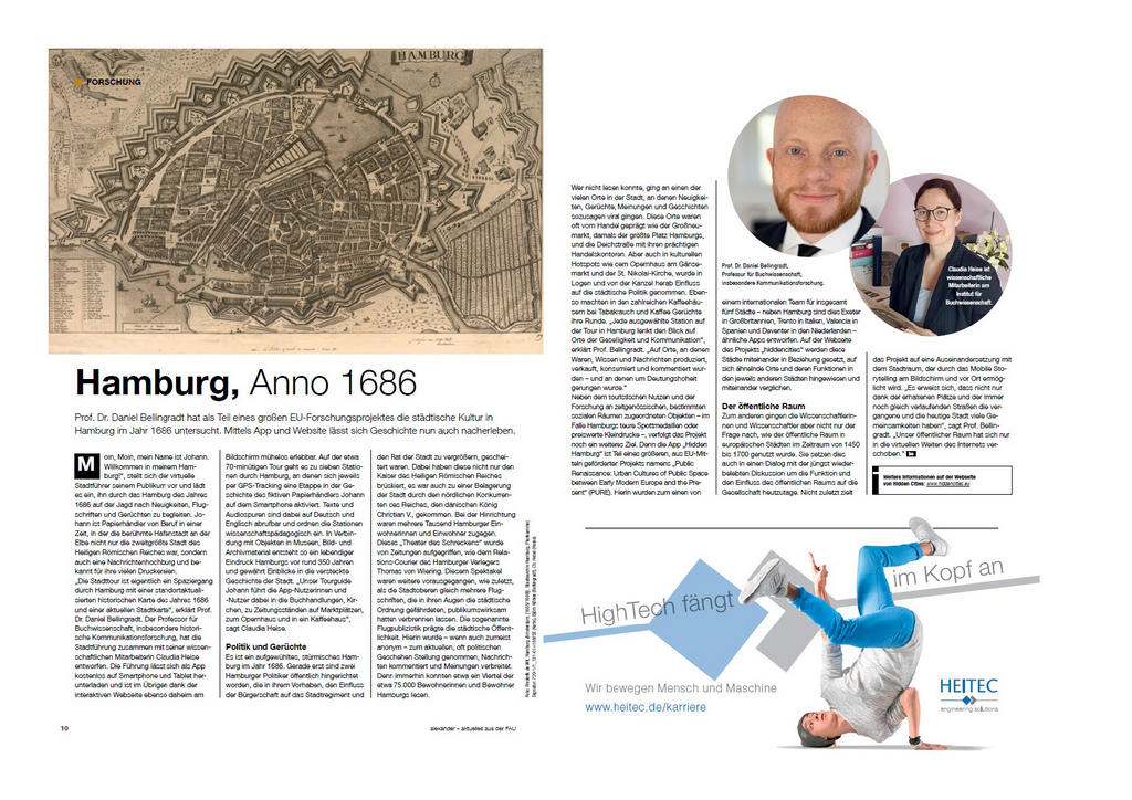 Both the App for Hamburg and the general project was highlighted in various German news channels, media platforms, radio stations, and newspapers. Among them was a report by Germany’s leading online news platform Der Spiegel, a project presentation by the German Federal Ministry of Education and Research (BMBF), and a few more media appearances, such as a portrait of the app and website in the FAU’s magazine Alexander (figure 1), a recommendation for a historical city walk on the official website of the city of Hamburg, reports in local newspapers such as the Stader Tageblatt, and interviews with Daniel Bellingradt on the radio channels Hamburg HH2 and Radio Hamburg for the XXL news and kid’s news.