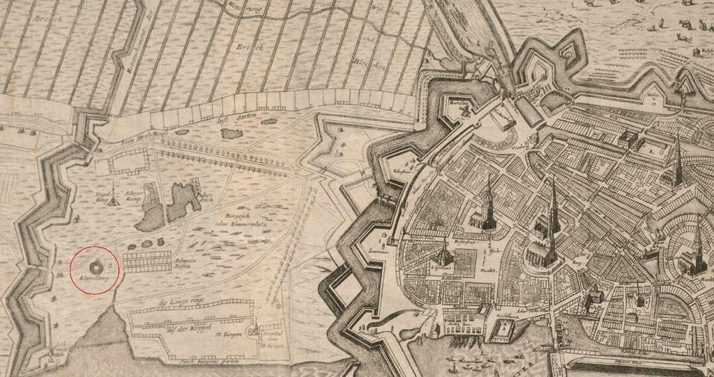 © Figure 1: The detail of the map by Samuel König (c. 1680) shows the execution site, the so-called Köppelberg, in the periphery of the city of Hamburg (Staatsarchiv Hamburg, Signatur: 720-1/1_131-01 = 68.42). Figure 2: Public execution of the two politicians Cord Jastram and Hieronymus Snitger on the Köppelberg, 4th October 1686 (Staatsarchiv Hamburg, Signatur: Sammelband A 320/22)].