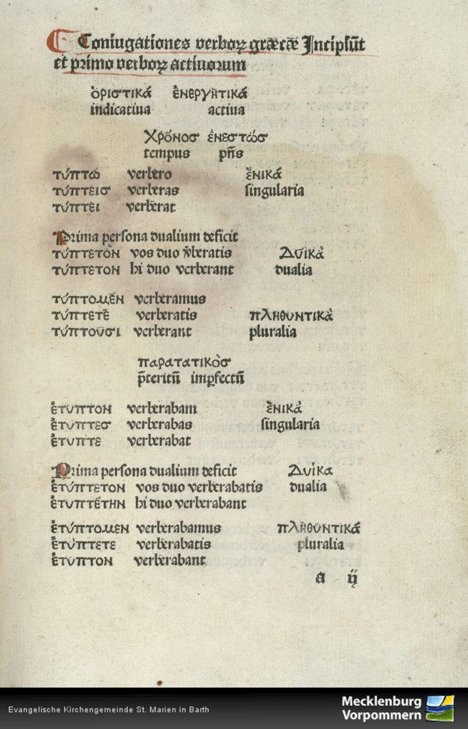 Illustration: Coniugationes verborum graecorum barytonorum, [Deventer: Richard Pafraet, before 12 Dec. 1488], the digital collections of the Universitätsbibliothek Greifswald for the Kirchenbibliothek Barth.